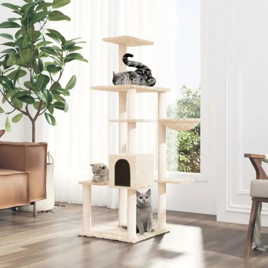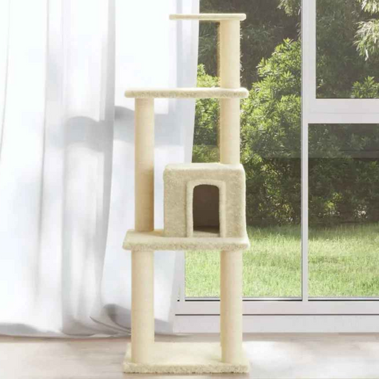Tall Cream Cat Tower with Soft House, Shelves & Scratch Posts