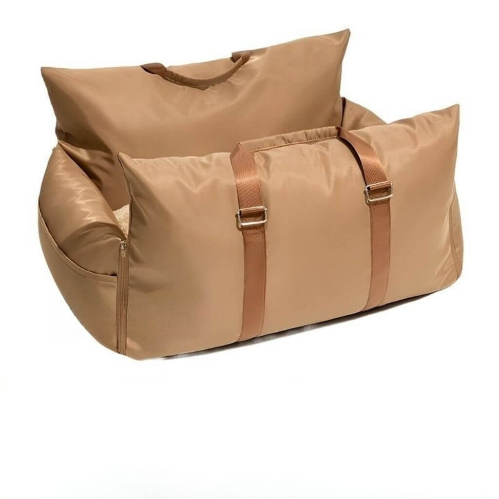 The NestRide is a waterproof dog car seat that doubles as a home bed. Raised padded sides keep your dog secure during braking. A reversible cushion flips between cool smooth fabric and warm plush fleece. The whole thing unzips into a flat bed when you're not driving. Oxford fabric wipes clean. Cushion inserts are removable and machine washable.